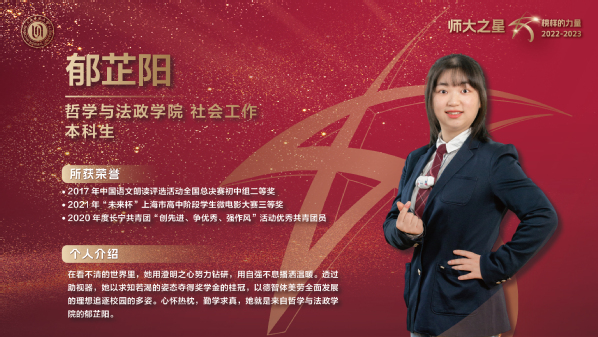 2023年11月30日,2022-2023年度“师大之星·榜样的力量”颁奖典礼于徐汇校区东部音乐厅隆重举行。我院学子郁芷阳同学在历经申报、初评、复评、终评后成功获评“师大之星”,成为了榜样的典例,彰显了榜样的力量。