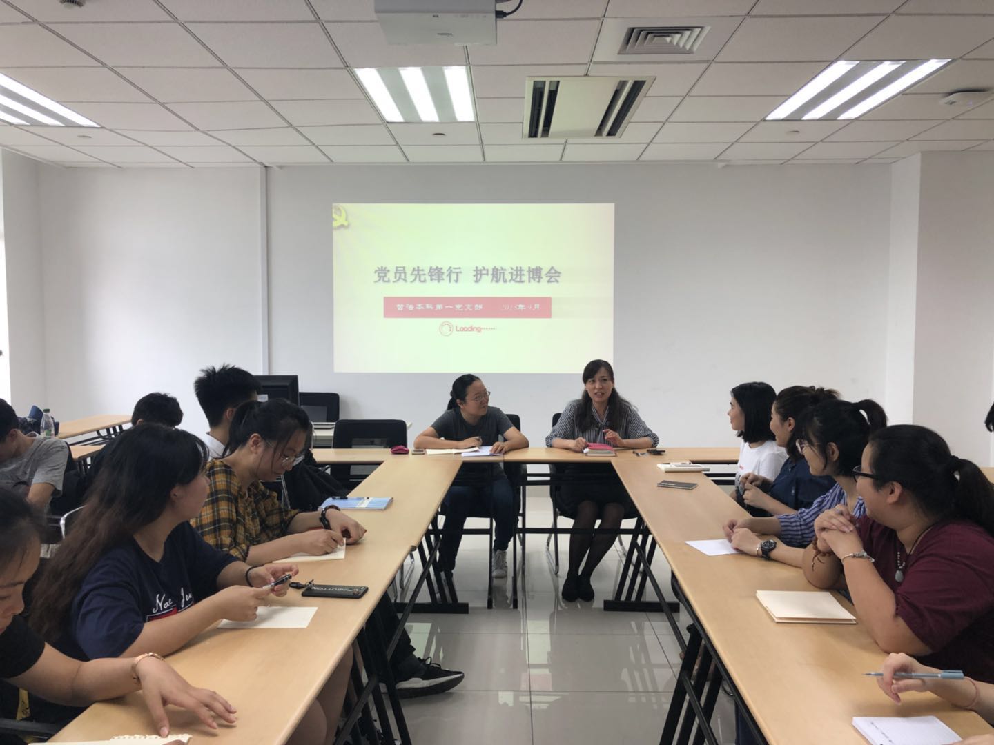 2018年9月19日,色情av影片 本科第一党支部“党员先锋行,护航进博会”主题党日活动在徐汇校区文科实验楼206顺利召开。党日活动由党支部副书记柳箫同志主持,色情av影片 党委副书记、副院长陈燕老师出席会议并讲话。