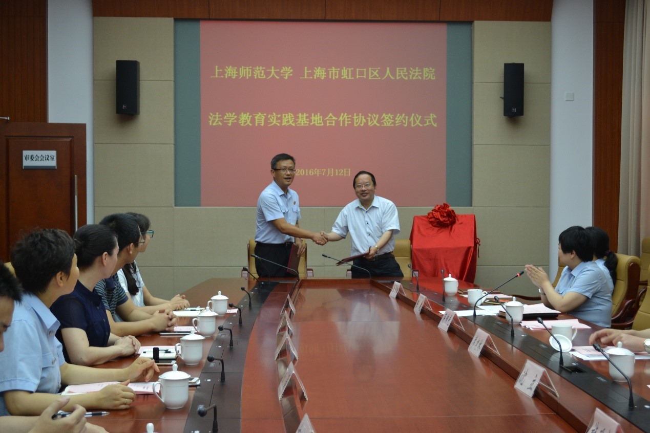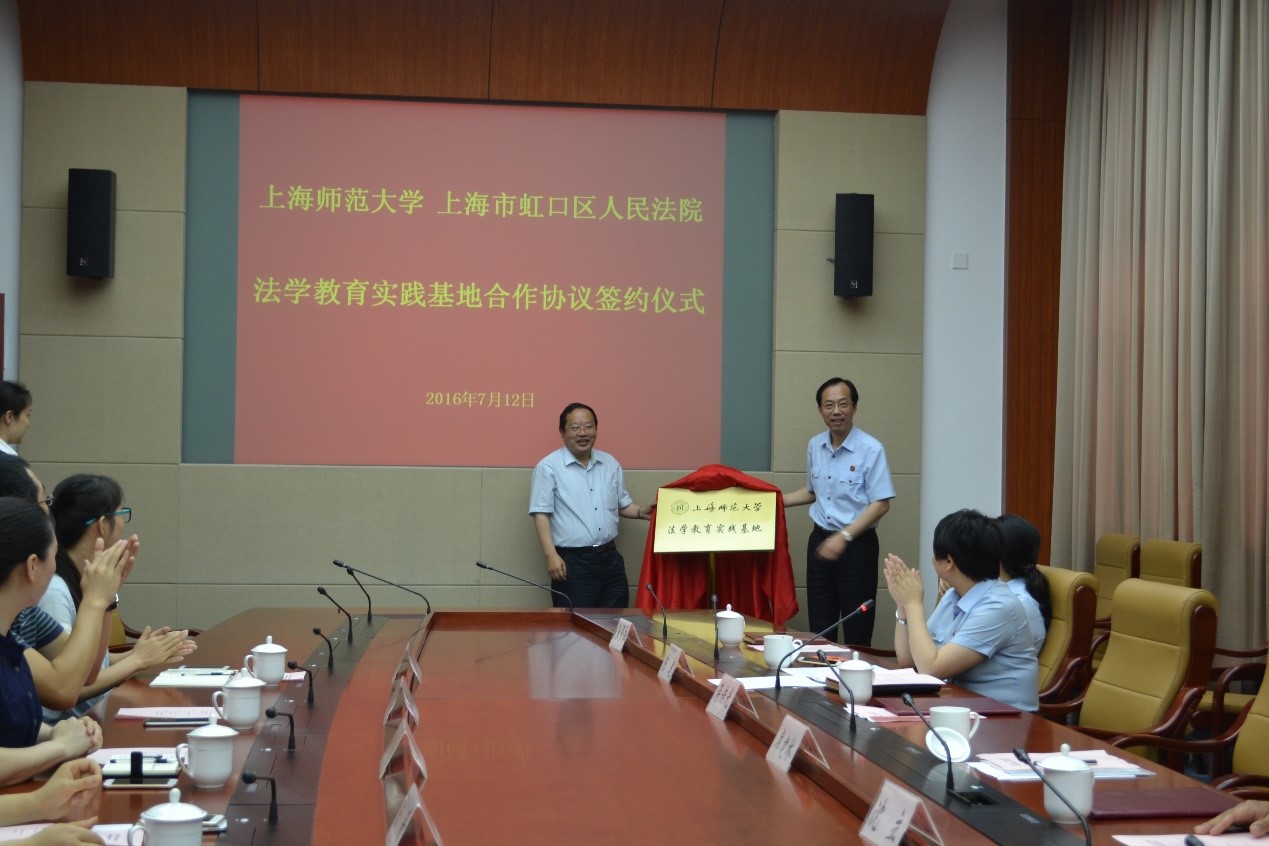 会议首先由虹口法院副院长沈力、哲法学院院长蒋传光签订法学教育实践基地合作协议,并由席建林院长、蒋传光院长为我校“法学教育实践基地”落户虹口法院揭牌。