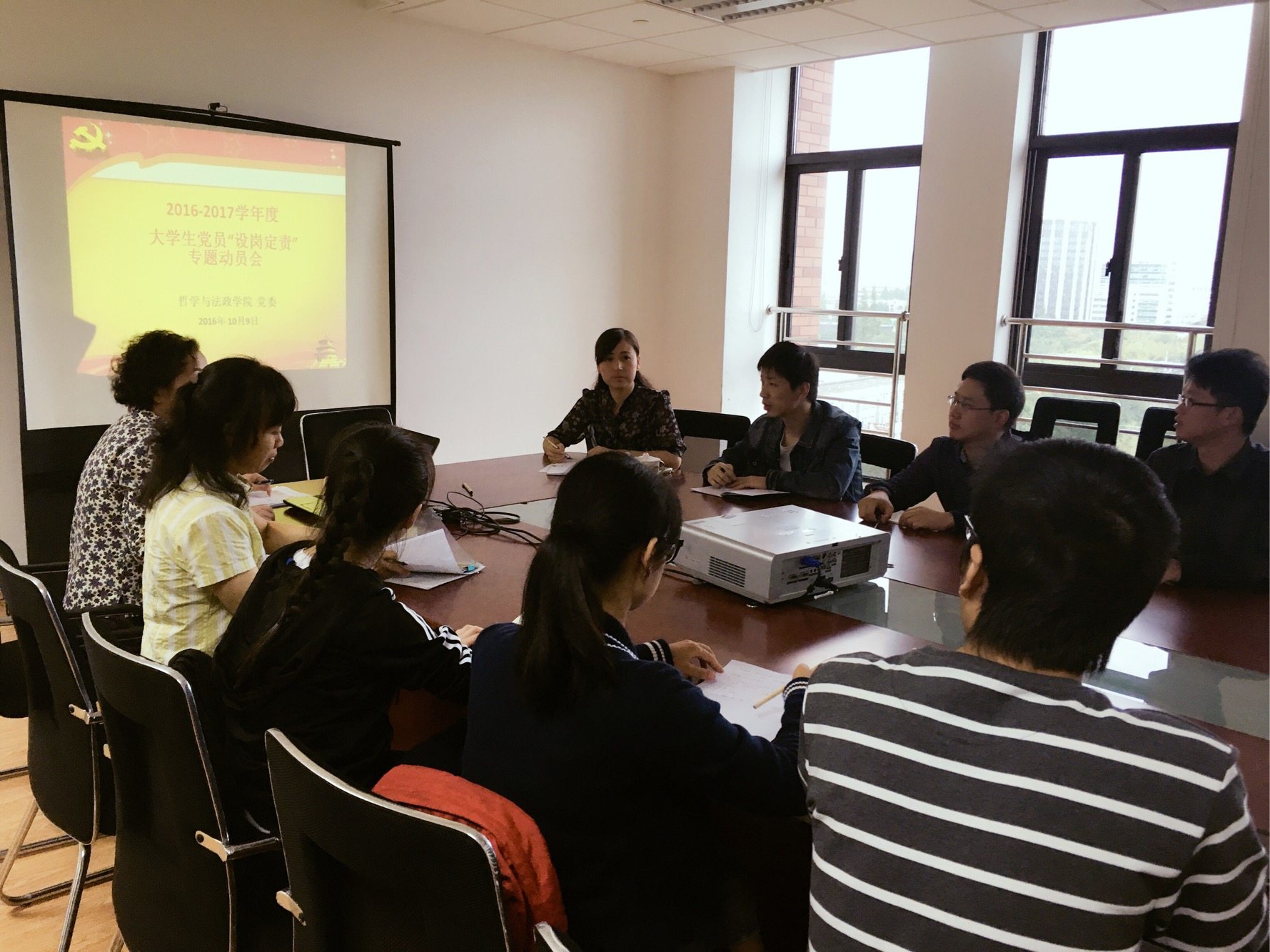 于徐汇校区文科实验楼808室召开“2016-2017学年度大学生党员设岗定责”专题动员会。院党委组织员陈敏老师主持此会议,院党委副书记副院长陈燕老师、辅导员王秀萍老师、樊青青老师和沈鸿雁老师出席了会议,全体本科和研究生党支部书记到场聆听。会议总结了两年来我院在大学生党员中开展“设岗定责”活动所取得的成果,并对新学年的相关工作提出了要求。