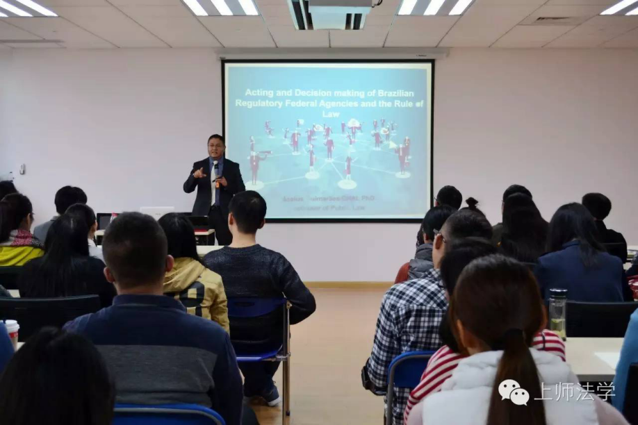 简短的聘任仪式之后,在蒋传光院长的主持下,柴教授为法律系师生100余人进行了主题为“巴西联邦机构决策和立法与法治”(Decision-making and Acting of Brazilian Federal Agencies and Rule of Law)的专题学术讲座。他以1988年《巴西联邦共和国宪法》为基础,结合1992年巴西宪法修正案,抽丝剥茧,将巴西的法治框架娓娓道来。巴西宪法,不仅仅是一部规范政治(权力)的宪法,同时也是一部规范经济(权力)的宪法。在法律系统和另外两种系统的结构性耦合之间,借助具体的宪法规范,自身也维系着内部的双向平衡。这种平衡在联邦机构上的体现,便是诸如环境、食品等领域,政府机构更加倾向保护消费者的权益。此次讲座还吸引了许多实务人士。比如,徐汇区人民检察院杨永勤副检察长在色情av影片