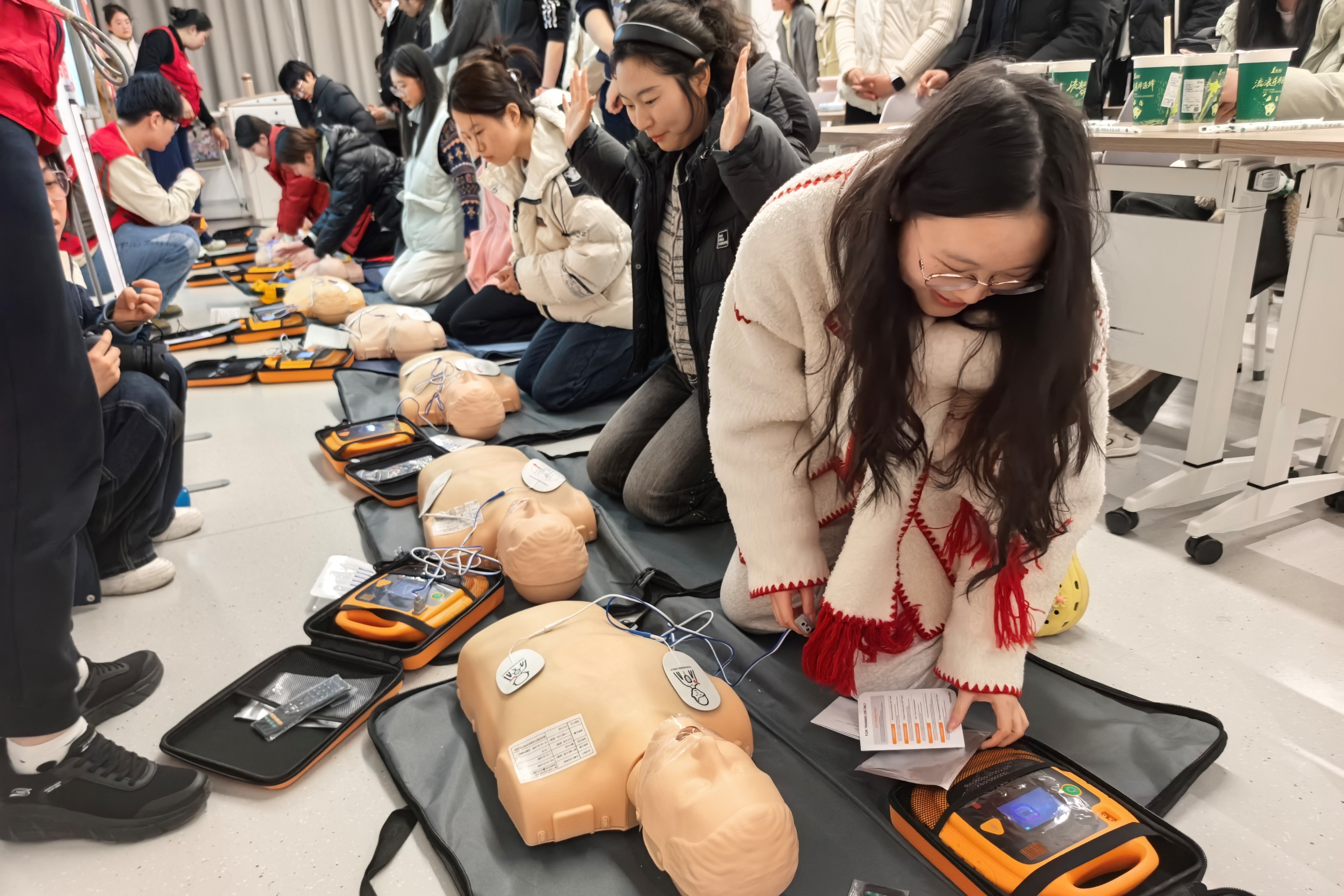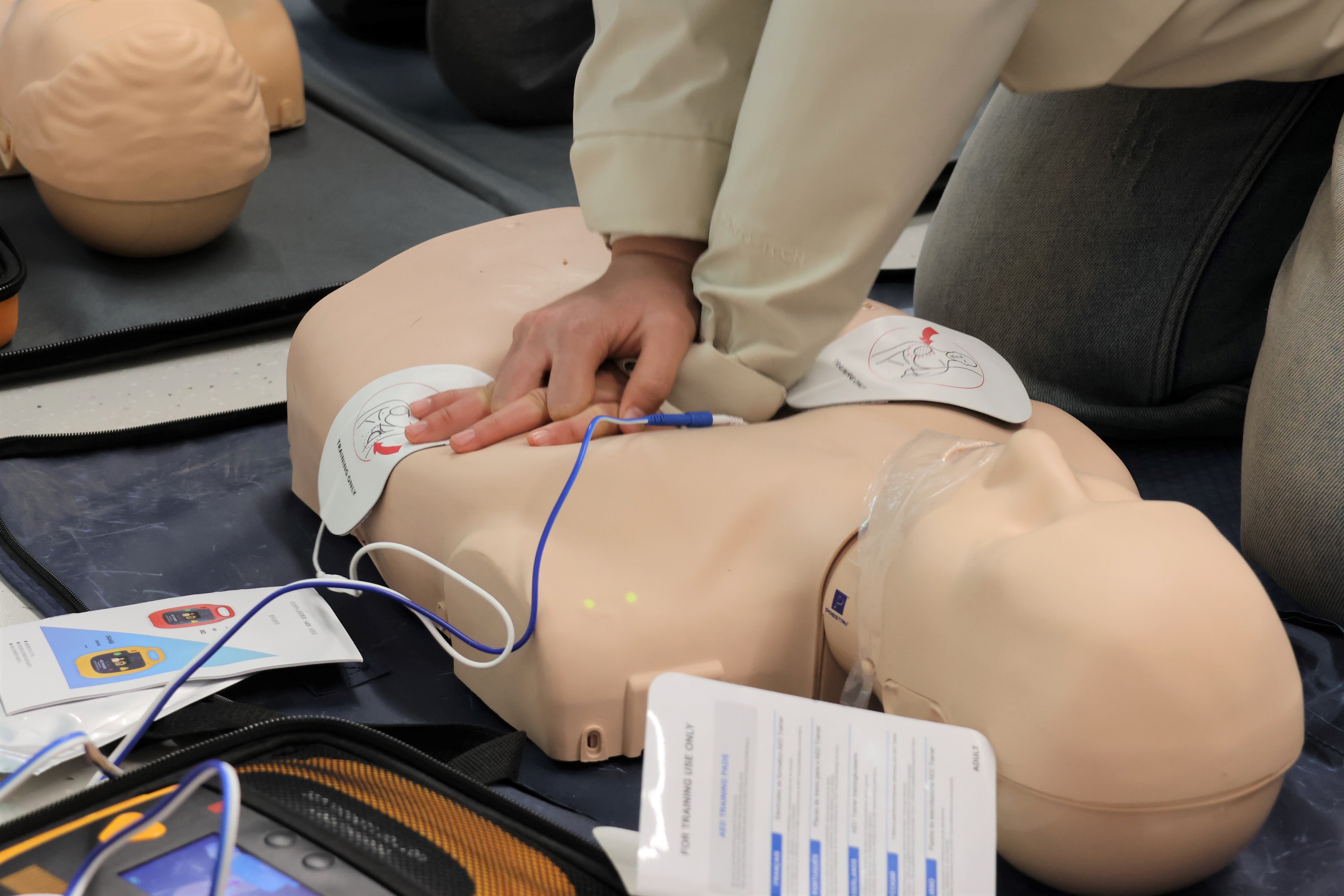 理论学习结束后,学员分组进入模拟演练区,在三位讲师指导下开展心肺复苏与AED使用的实操训练。面对教学假人模型,学员依次进行胸外按压、电极片贴放等操作,讲师逐一纠正动作,确保按压位置、深度、频率规范。随后的情境考核环节,学员依次完成环境评估、呼救、CPR、AED使用等全流程操作。学员们顺利通过考核并获得AED急救员认证,纷纷表示通过实战演练不仅掌握了技能,更增强了应对突发事件的信心。