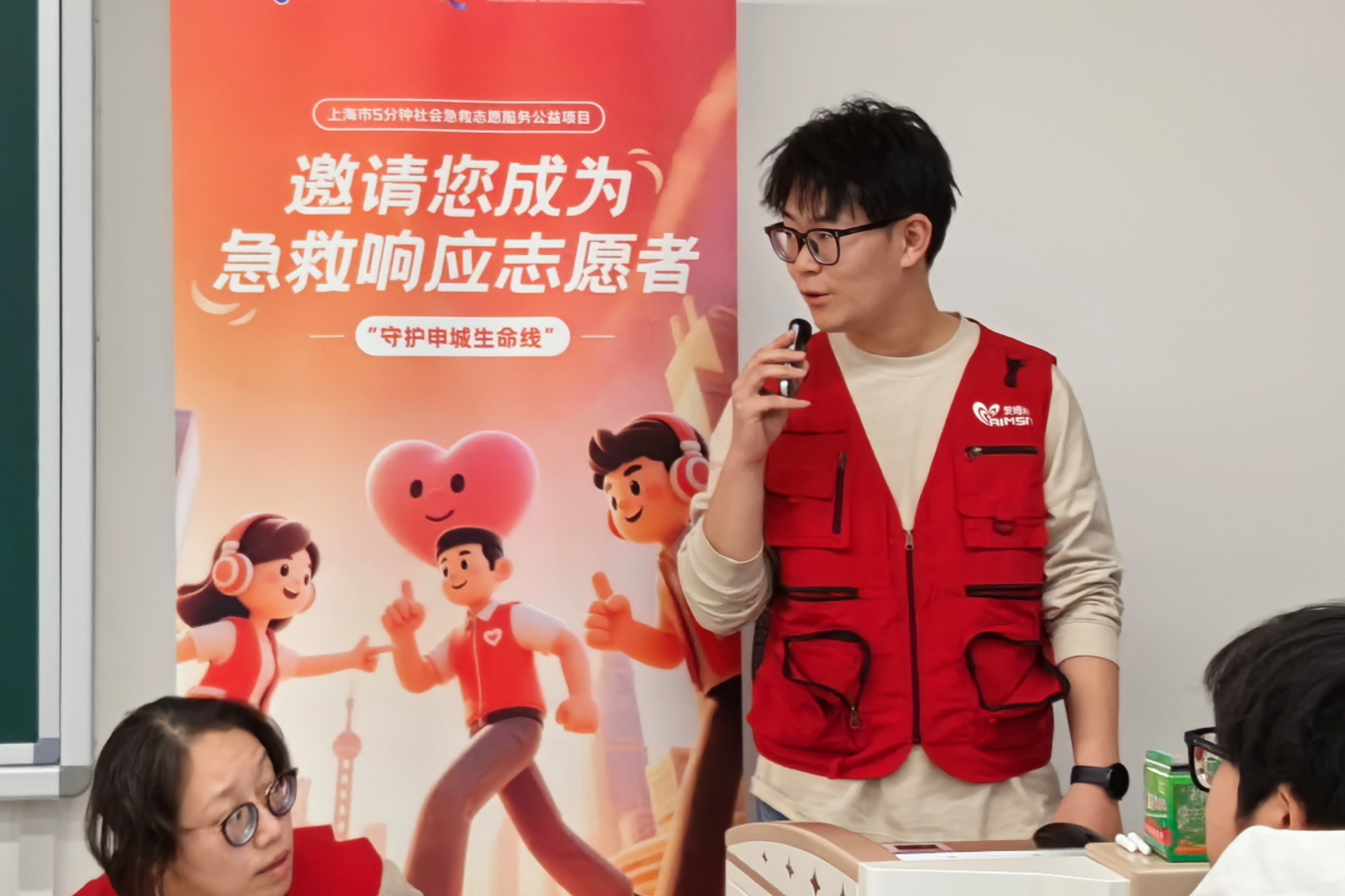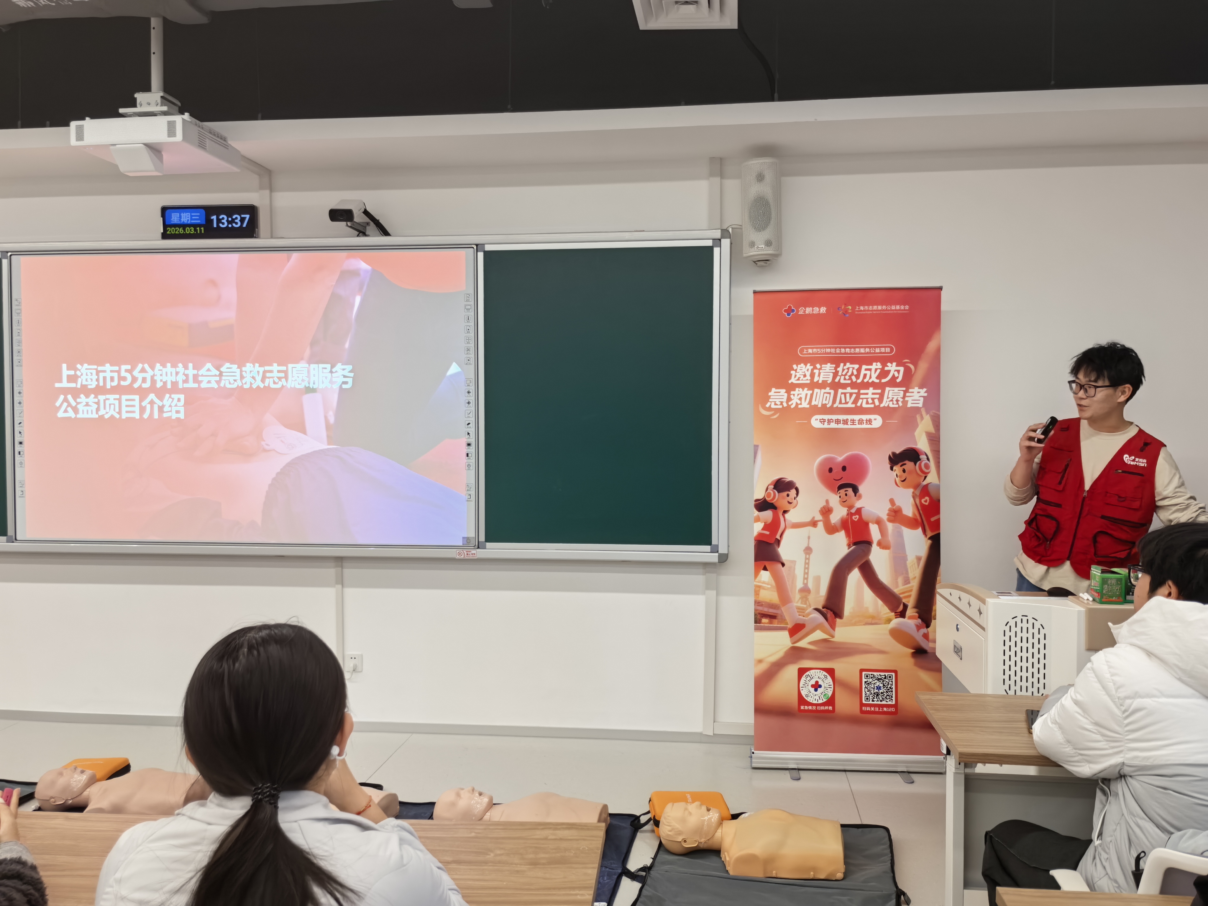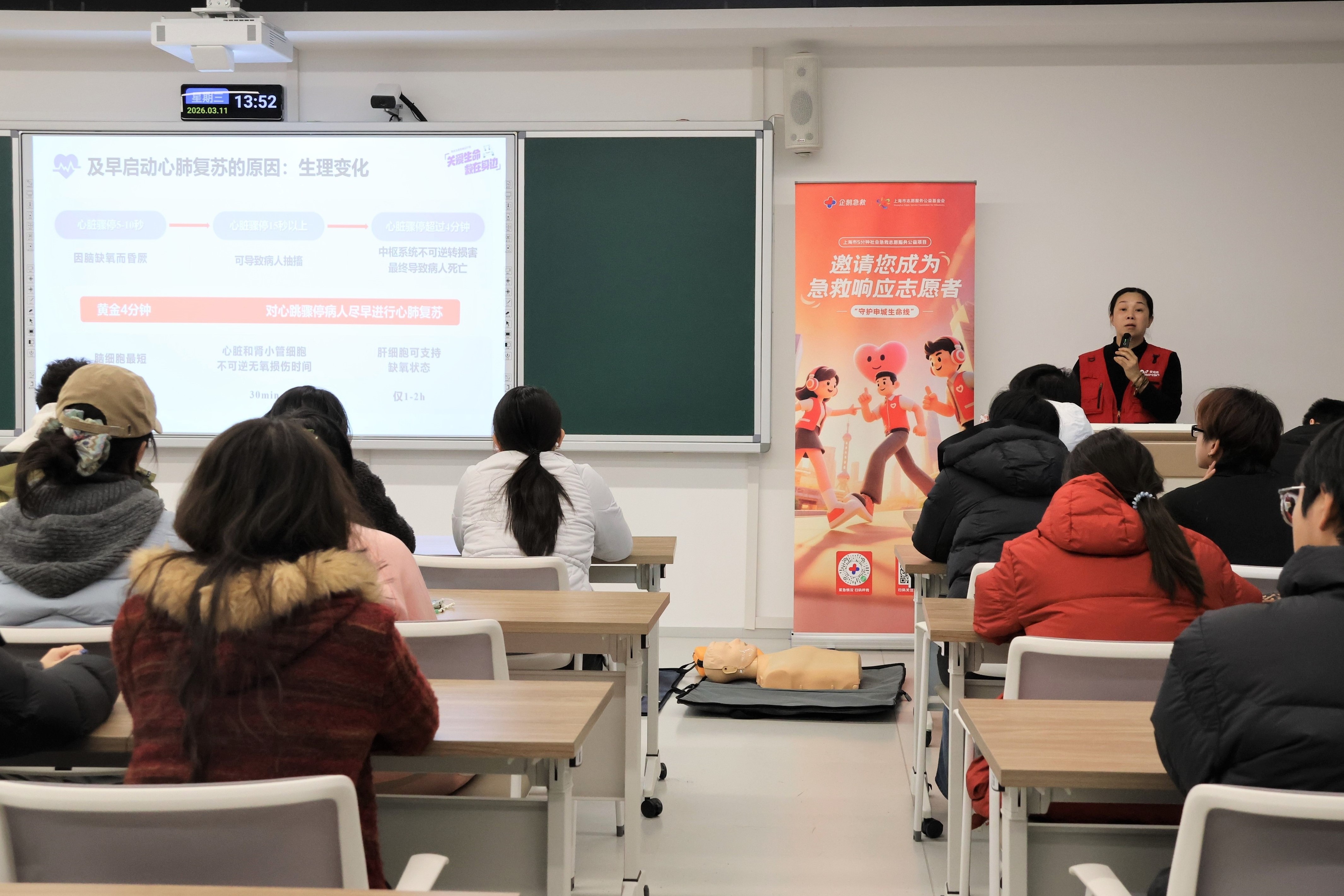 课程由上海市5分钟社会急救志愿服务公益项目导师主讲,通过“叫叫CABD”口诀为线索,系统讲解成人基础生命支持操作流程,涵盖现场环境评估、意识判断、呼救求助、胸外按压、开放气道、人工呼吸及AED使用等环节。同时,讲师结合特殊情境补充讲解气道异物梗阻、溺水、孕妇及儿童等群体的急救要点。理论讲解过程中穿插知识问答,学员们踊跃互动,在问答中巩固了按压深度频率、AED使用时机等核心知识点,现场气氛热烈。
