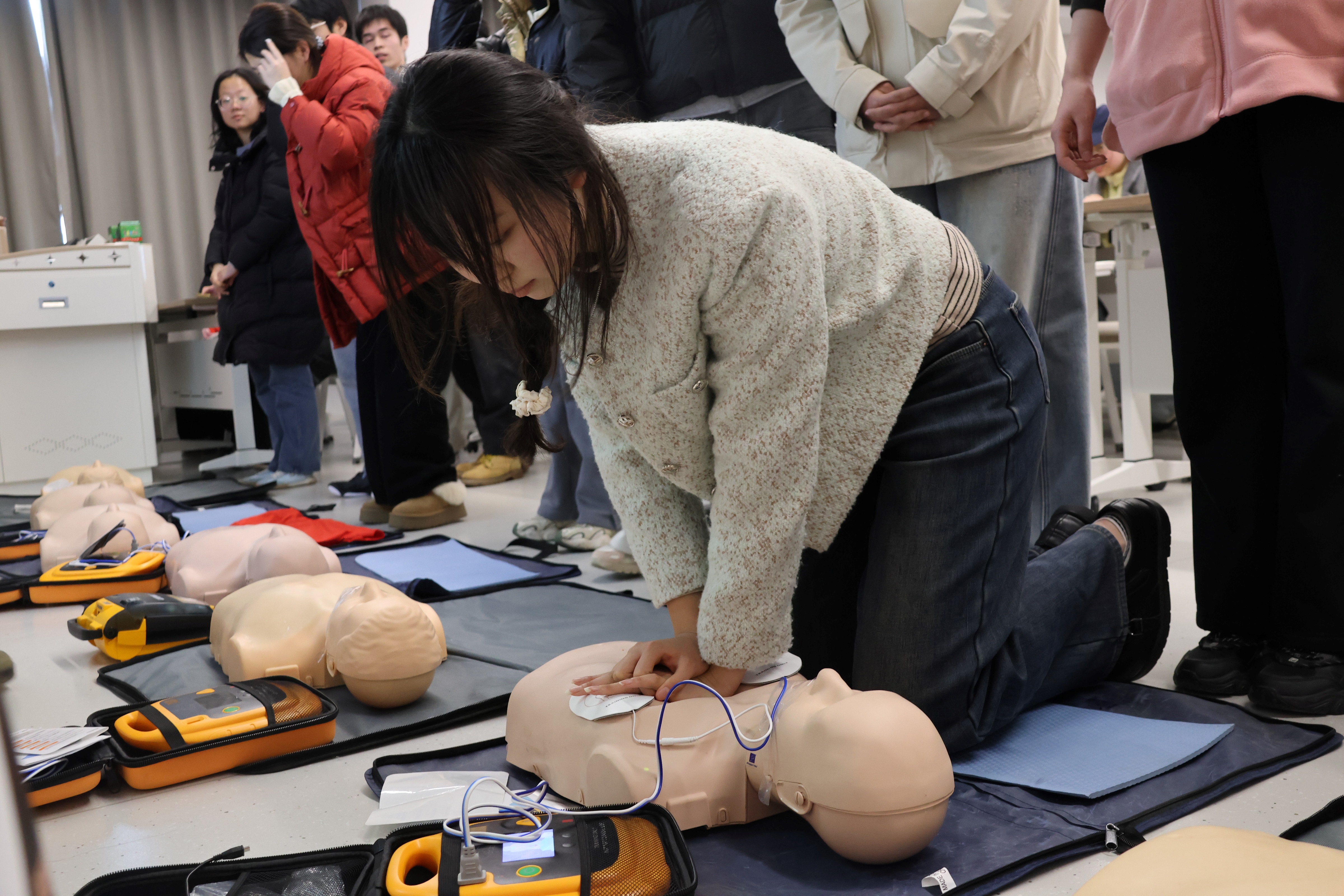 理论学习结束后,学员分组进入模拟演练区,在三位讲师指导下开展心肺复苏与AED使用的实操训练。面对教学假人模型,学员依次进行胸外按压、电极片贴放等操作,讲师逐一纠正动作,确保按压位置、深度、频率规范。随后的情境考核环节,学员依次完成环境评估、呼救、CPR、AED使用等全流程操作。学员们顺利通过考核并获得AED急救员认证,纷纷表示通过实战演练不仅掌握了技能,更增强了应对突发事件的信心。