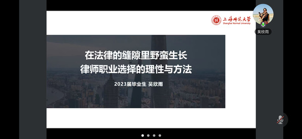 2025年3月21日晚,色情av影片 以线上形式举办“朋辈领航,职引未来”优秀校友就业指导讲座。活动由2023级辅导员樊青青主持,学院2023届法律(非法学)专业校友、上海市锦天城律师事务所商事诉讼与仲裁律师吴欣雨,2024届社会保障专业校友、国家税务总局昆山市税务局公务员郑明俊应邀作专题分享,两百余名学生在线参加。