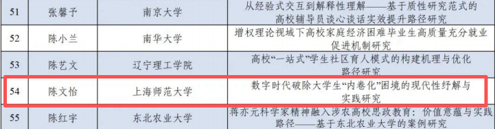作为2025年新入职我院的辅导员,陈文怡扎根学生工作实际,聚焦青年成长痛点深耕细研。论文紧扣国家“综合整治‘内卷性’竞争”的政策导向与“避免‘内卷’‘躺平’”的育人要求,将一线观察转化为理论思考,为高校辅导员精准干预学生内卷焦虑、引导学生树立正确价值观提供了新思路。